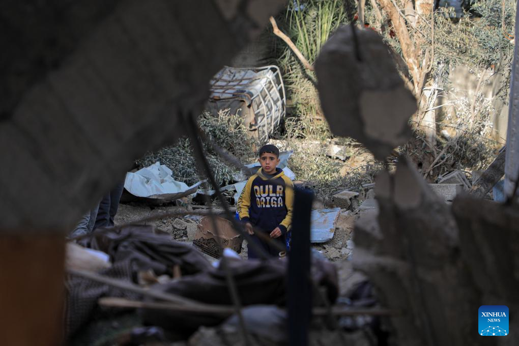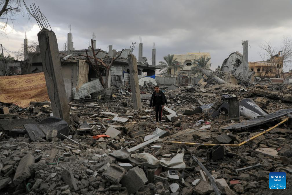 A Palestinian child walks on the rubble in the southern Gaza Strip city of Rafah, Jan. 27, 2024. The Palestinian death toll from the ongoing Israeli attacks on the Gaza Strip has risen to 26,422 since its outbreak on Oct. 7, 2023, the Hamas-run Health Ministry said Sunday.