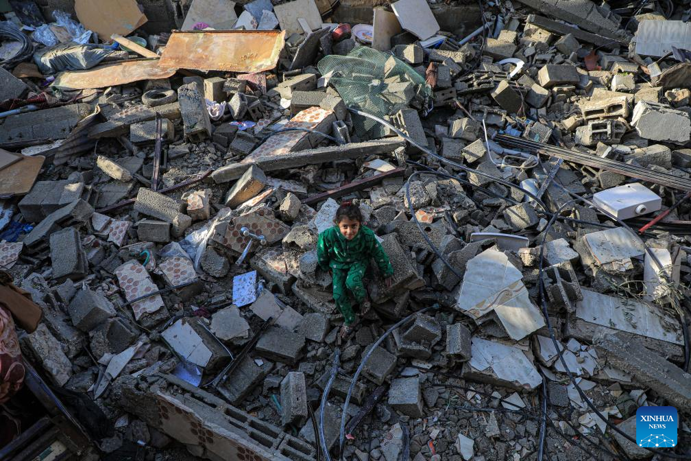 A Palestinian child is seen on the rubble in the southern Gaza Strip city of Rafah, Jan. 27, 2024. The Palestinian death toll from the ongoing Israeli attacks on the Gaza Strip has risen to 26,422 since its outbreak on Oct. 7, 2023, the Hamas-run Health Ministry said Sunday.