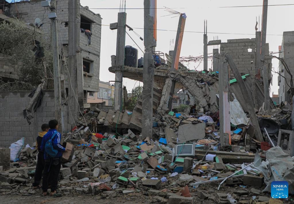 Palestinian children watch the rubble in the southern Gaza Strip city of Rafah, Jan. 27, 2024. The Palestinian death toll from the ongoing Israeli attacks on the Gaza Strip has risen to 26,422 since its outbreak on Oct. 7, 2023, the Hamas-run Health Ministry said Sunday.