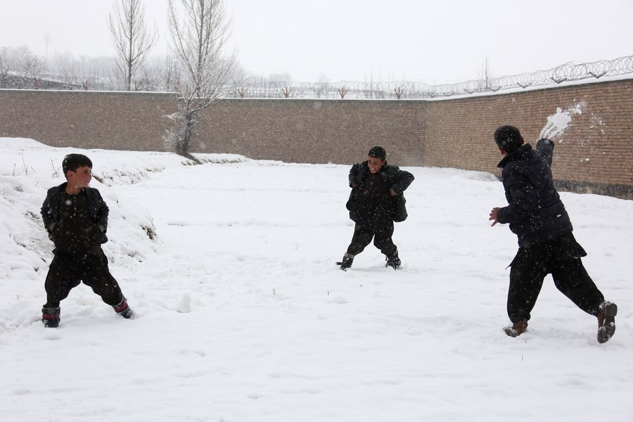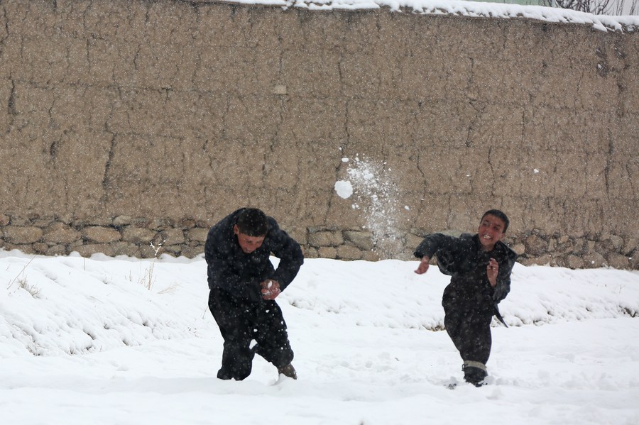 Children play with snow in the Paghman District of Kabul, capital of Afghanistan. Jan. 28, 2024. (Photo by Saifurahman Safi/Xinhua)