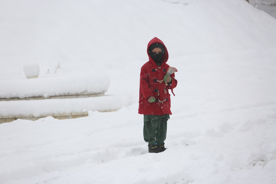 A child stands on the snowy ground in the Paghman district of Kabul, capital of Afghanistan. Jan. 28, 2024. (Photo by Saifurahman Safi/Xinhua)