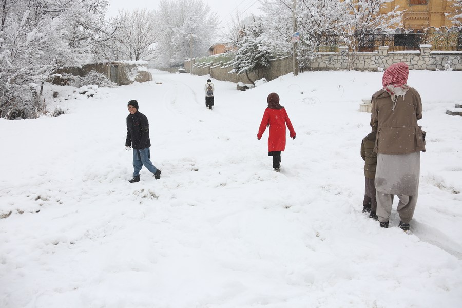 People are seen on the snowy ground in the Paghman district of Kabul, capital of Afghanistan. Jan. 28, 2024. (Photo by Saifurahman Safi/Xinhua)