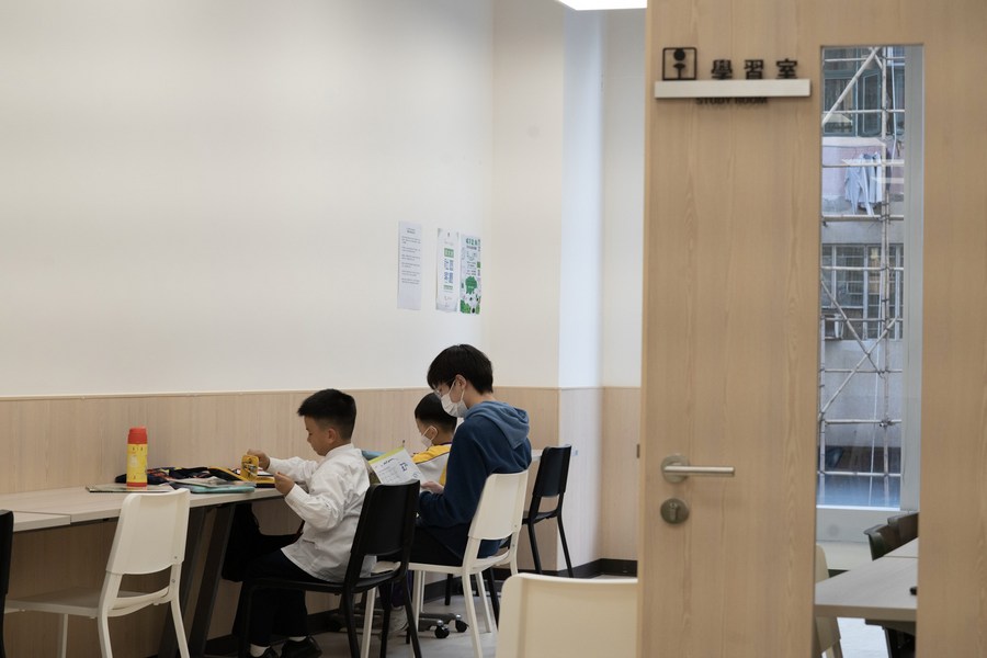 A college student volunteer helps children with homework in the first community living room in Hong Kong, south China, Jan. 5, 2024. (Xinhua/Long Jingyi)