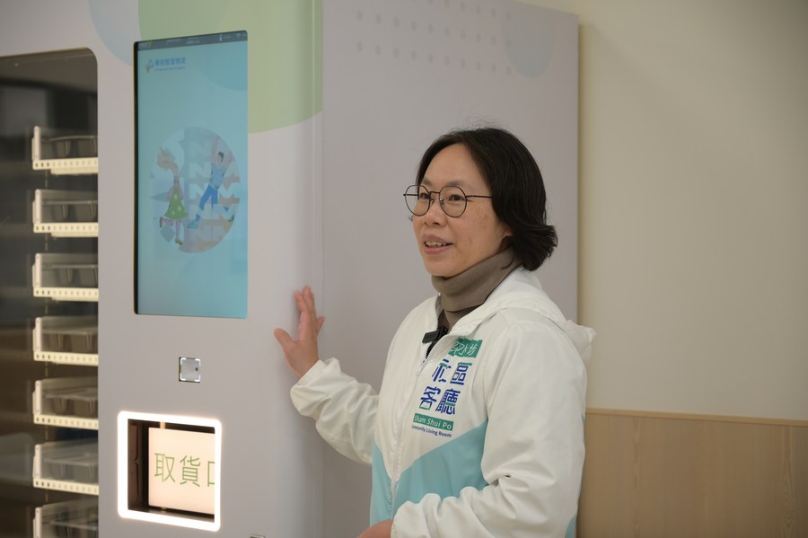 Alice Lau Oi Sze, chief executive of the Lok Sin Tong Benevolent Society, Kowloon, introduces the first community living room in Hong Kong, south China, Jan. 11, 2024. (Xinhua/Tan Jiaming)