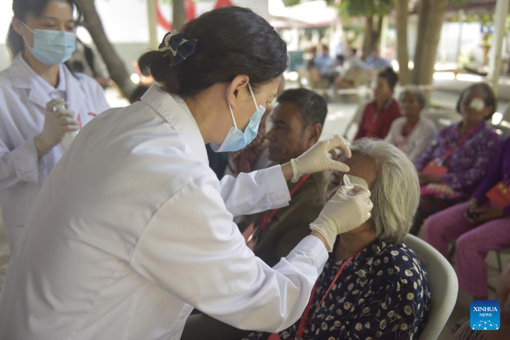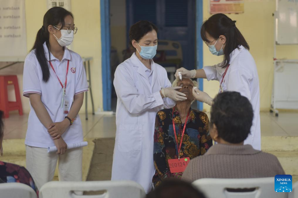 A Chinese doctor examines a patient's eyes in Prey Veng province, Cambodia, Jan. 28, 2024. (Photo by Liao Hongqing/Xinhua)