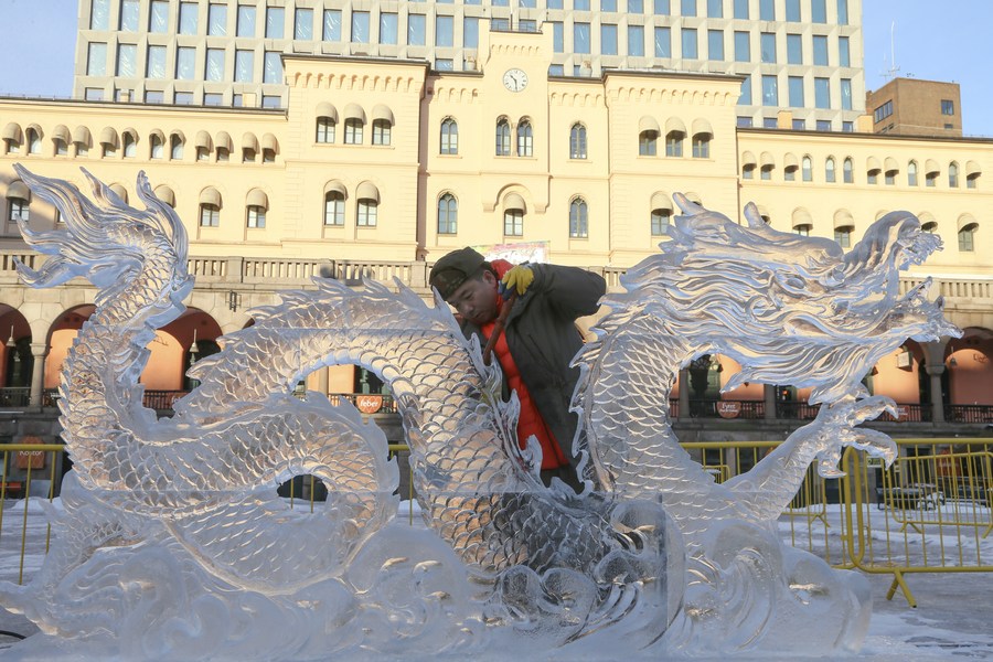 "To extend New Year's greetings and invite the Norwegian people to visit China, we have brought in artists from Harbin to create ice sculptures, including the 'Lucky Dragon' and the 'Hello, China' panda," Hou said.