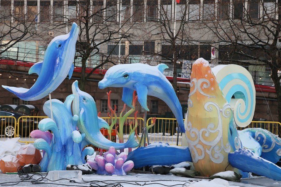 The "Hello, China" Ice Sculpture and Lantern Art Exhibition showcases the artistic talents of ice sculptors from Harbin, in northeast China's Heilongjiang Province, as well as lantern makers from Zigong in southwest China's Sichuan Province.