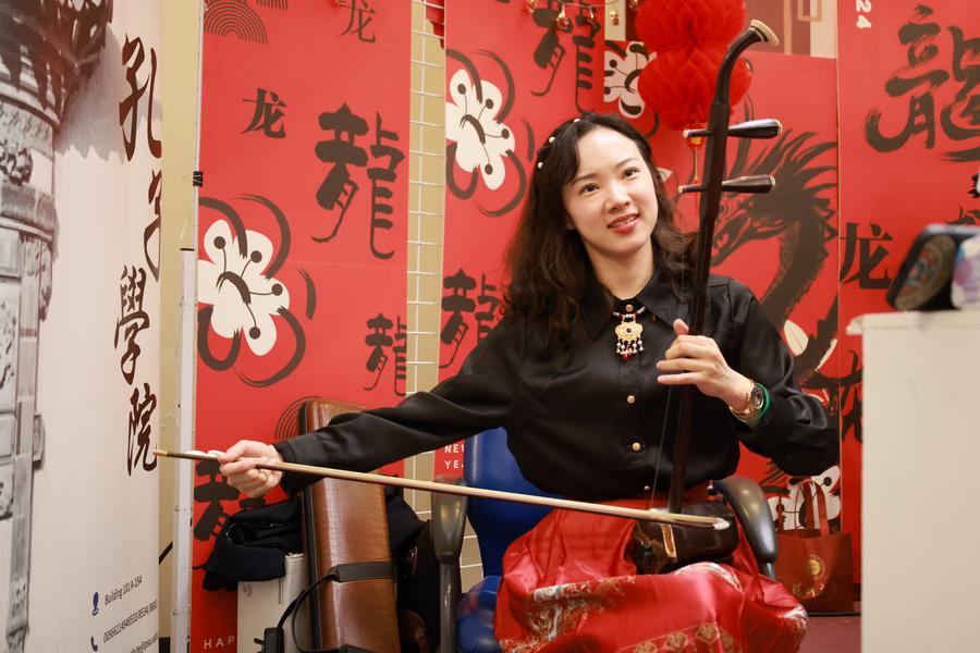 These volunteers, along with Confucius Institute teachers, presented a series of cultural performances, including demonstrating traditional Chinese dragon dances and Chinese shadow puppetry, playing the erhu, a traditional Chinese musical instrument, and performing tai chi fans.