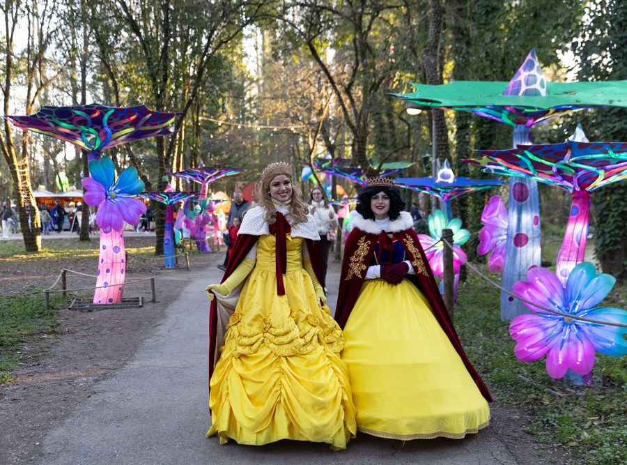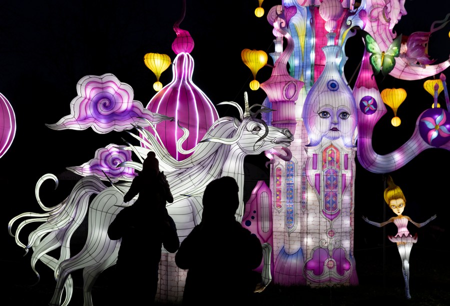 Visitors look at lanterns during the International Lantern Festival "Lanternia" in Cassino, central Italy, Jan. 28, 2024. (Xinhua/Li Jing)