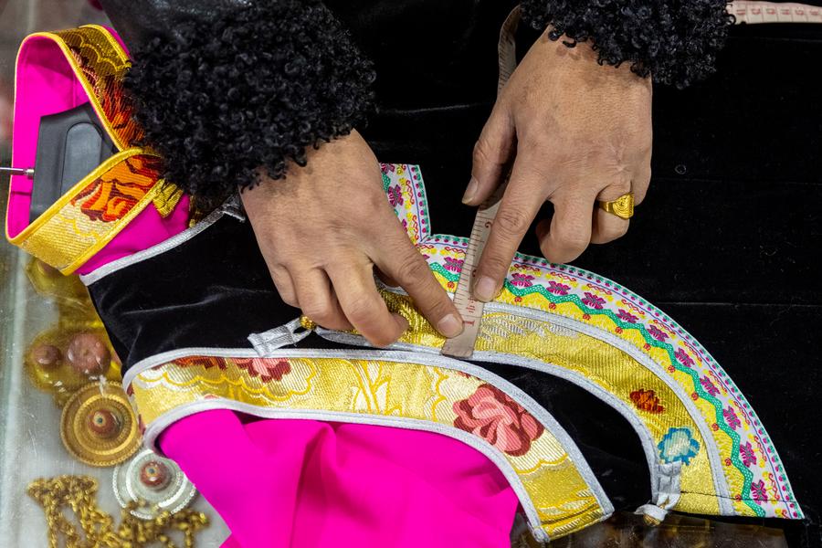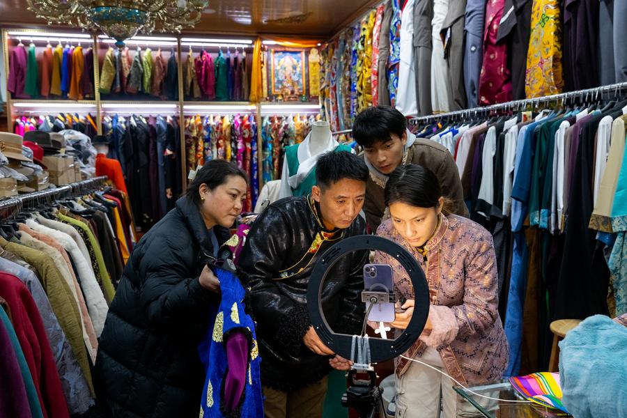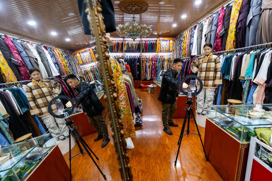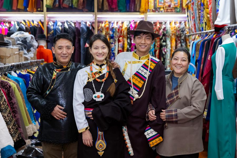 Nyima Wangden poses for a group photo with his two children and wife (L-R) at his clothing store in Chengdu, southwest China's Sichuan Province, Jan. 5, 2024. (Xinhua/Shen Bohan)Nyima Wangden (2nd L) and his wife Hoing Je (1st L) sell traditional Tibetan costumes with the help of their two children via live streaming at their clothing store in Chengdu, southwest China's Sichuan Province, Jan. 5, 2024. (Xinhua/Shen Bohan)Nyima Wangden (L) selects cloth for traditional Tibetan costumes at a market in Chengdu, southwest China's Sichuan Province, Jan. 5, 2024. (Xinhua/Shen Bohan)Nyima Wangden (L) and his daughter sell traditional Tibetan costumes via live streaming at their clothing store in Chengdu, southwest China's Sichuan Province, Jan. 5, 2024. (Xinhua/Shen Bohan)Nyima Wangden (R) and his wife Hoing Je (L) help their son put on traditional Tibetan costumes in preparation for the live streaming at their clothing store in Chengdu, southwest China's Sichuan Province, Jan. 5, 2024. (Xinhua/Shen Bohan)Nyima Wangden shows cloth for traditional Tibetan costumes to his customer via video chat at a market in Chengdu, southwest China's Sichuan Province, Jan. 5, 2024. (Xinhua/Shen Bohan)Nyima Wangden designs traditional Tibetan costumes according to a customer's request at his clothing store in Chengdu, southwest China's Sichuan Province, Jan. 4, 2024. (Xinhua/Shen Bohan)Nyima Wangden (R) helps his customer fit traditional Tibetan costumes at his clothing store in Chengdu, southwest China's Sichuan Province, Dec. 21, 2023. (Xinhua/Shen Bohan)Nyima Wangden opens his clothing store to business early morning in Chengdu, southwest China's Sichuan Province, Jan. 4, 2024. (Xinhua/Shen Bohan)Nyima Wangden carries newly made traditional Tibetan costumes for delivery in Chengdu, southwest China's Sichuan Province, Jan. 4, 2024. (Xinhua/Shen Bohan)Nyima Wangden films people dancing in traditional Tibetan costumes provided by his clothing store in Chengdu, southwest China's Sichuan Province, Jan. 20, 2024. (Xinhua/Shen Bohan)Nyima Wangden (1st R) discusses community governance issues with other business representatives at a community service center in Chengdu, southwest China's Sichuan Province, Jan. 16, 2024. (Xinhua/Shen Bohan)