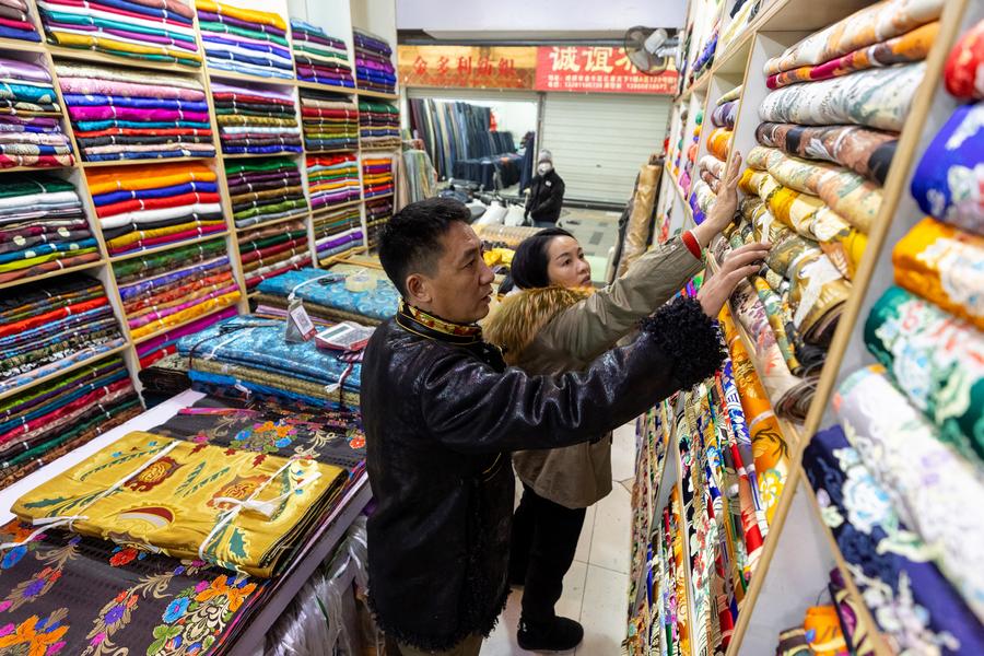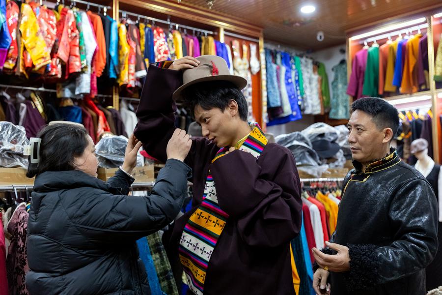 CHENGDU, Jan. 31 (Xinhua) -- Nyima Wangden, a Tibetan businessman hailing from Heishui County of Aba Tibetan and Qiang Autonomous Prefecture in Sichuan, has lived in Chengdu, the provincial capital, for over two decades. Nyima Wangden and his wife Hoing Je, both of whom had inherited the crafts of designing and making traditional Tibetan costumes from their elders, have been operating a specialty clothing store in Jinniu District of Chengdu since 2016.