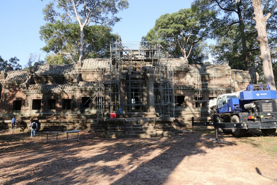 This undated photo shows staff members working at the restoration site of the western gate of Banteay Kdei temple in Angkor Archaeological Park in Siem Reap province, Cambodia. (APSARA National Authority/Handout via Xinhua)