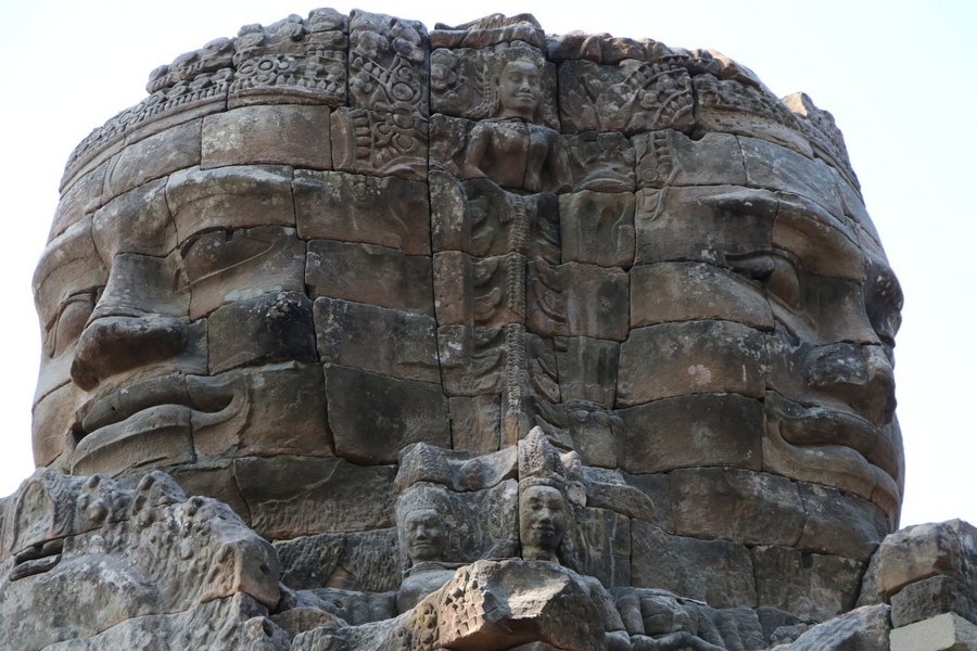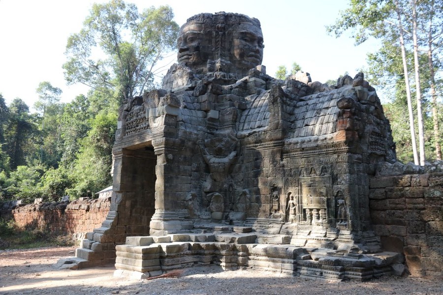 This undated photo shows the Brahma faces at the central tower of the western gate of Banteay Kdei temple in Angkor Archaeological Park in Siem Reap province, Cambodia. (APSARA National Authority/Handout via Xinhua)