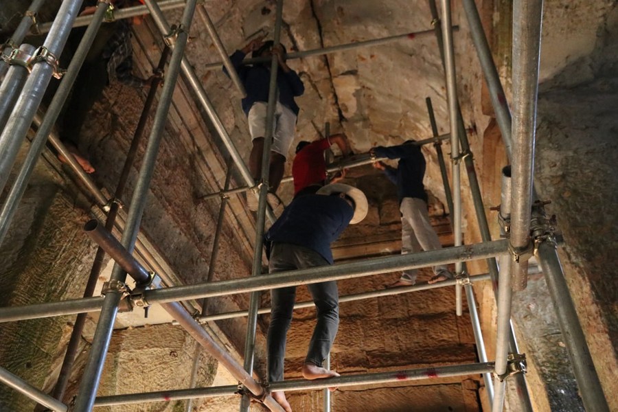This undated photo shows the restoration site of the Angkor Wat's eastern gate's roof in Angkor Archaeological Park in Siem Reap province, Cambodia. (APSARA National Authority/Handout via Xinhua)