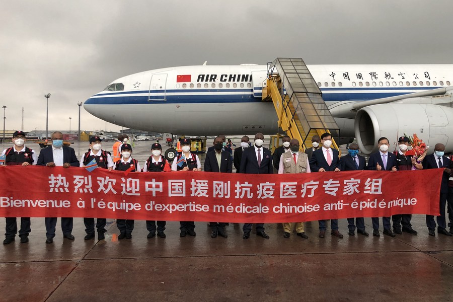 The file photo shows members of a Chinese medical team posing for a photo upon their arrival at the airport with officials from China and the Democratic Republic of the Congo (DRC) in Kinshasa, DRC, May 12, 2020. (Photo by Zhou Guanglin/Xinhua)