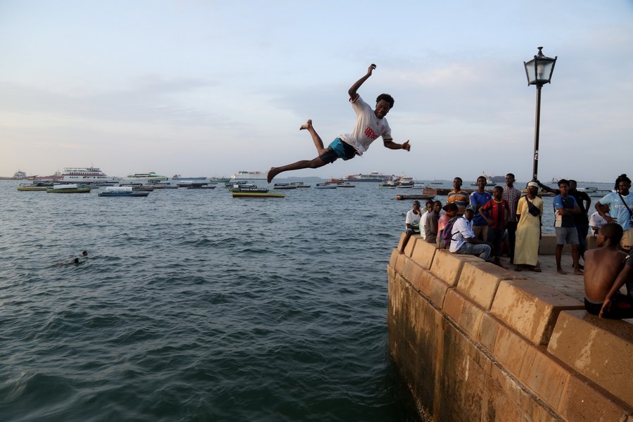 A man jumps into the water for fun on the shore of Stone Town in Zanzibar, Tanzania, Jan. 11, 2024. (Photo by Emmanuel Herman/Xinhua)