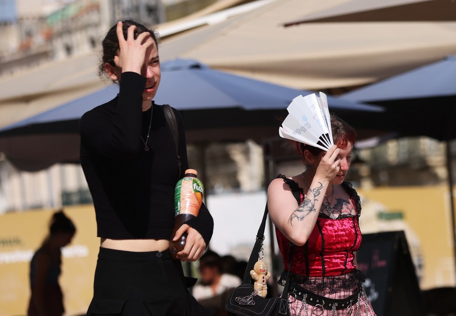 People walk at the Place de Comedie as the highest temperature reaches 38 degrees centigrade in Montpellier, southern France, July 19, 2023. (Xinhua/Gao Jing)■