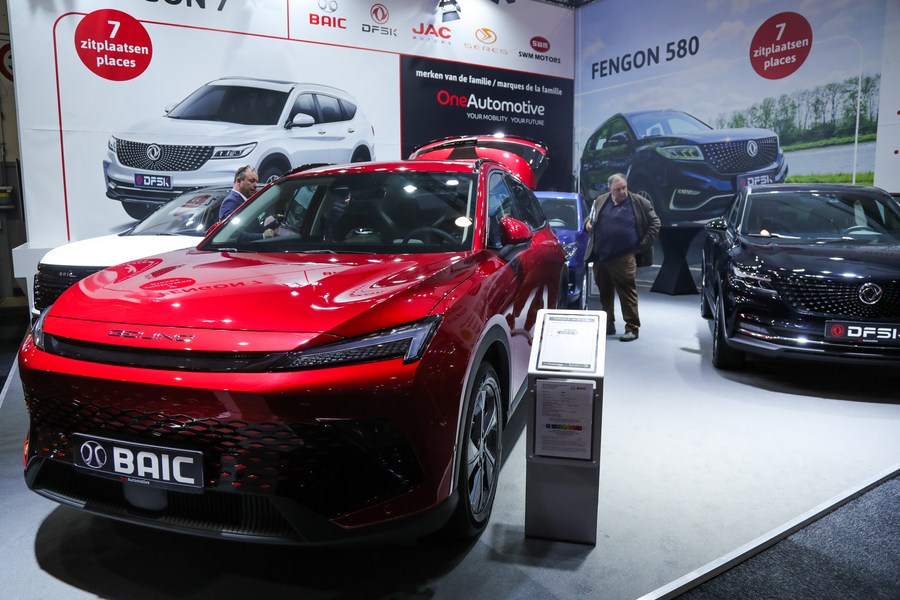 People visit the exhibition area of BAIC and DFSK during a media preview of the 100th Brussels Motor Show in Brussels, Belgium, Jan. 13, 2023. (Xinhua/Zheng Huansong)