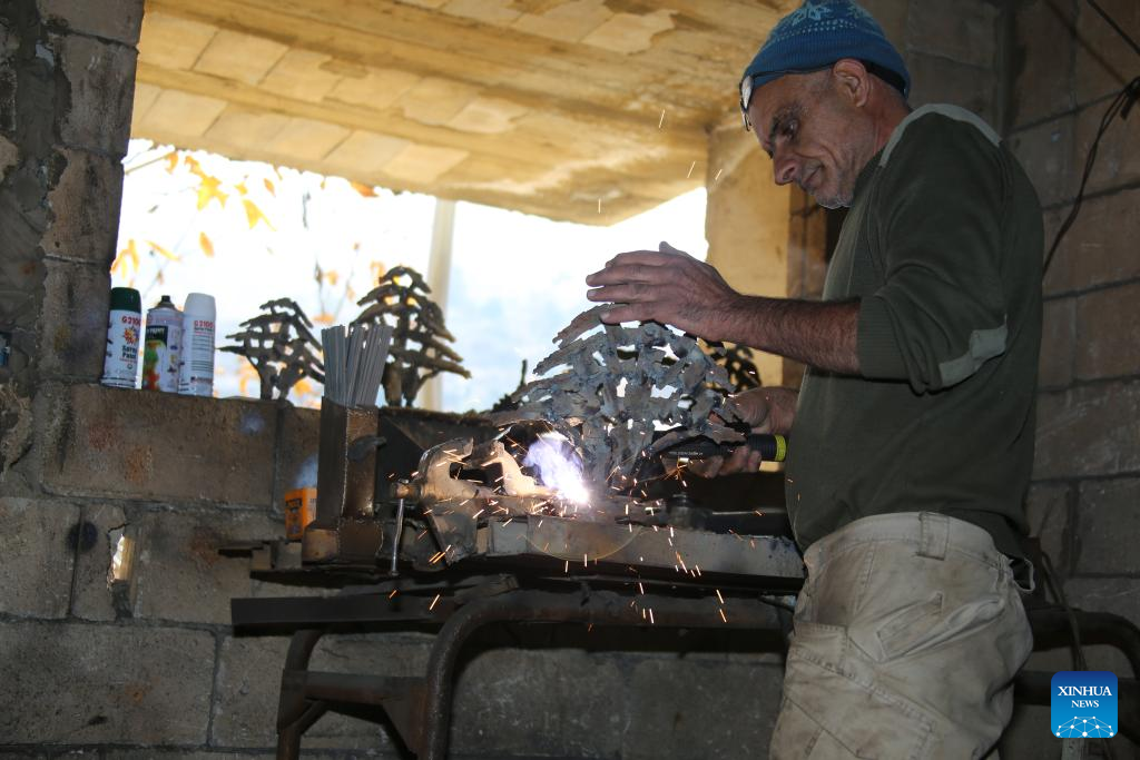 Mohammad Nassif works on his artistic work at his workshop in Shebaa, Lebanon, Dec. 27, 2023. Mohammad Nassif, a 60-year-old Lebanese artist, spends long hours every day at his workshop in Shebaa, a town on the southeastern tip of Lebanon, cutting and bending fragments of Israeli shells to transform them into artistic models. (Photo by Taher Abou Hamdan/Xinhua)