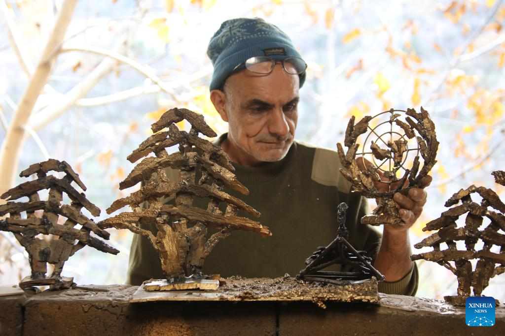 This photo taken on Dec. 27, 2023 shows Mohammad Nassif and his artistic works at his workshop in Shebaa, Lebanon. Mohammad Nassif, a 60-year-old Lebanese artist, spends long hours every day at his workshop in Shebaa, a town on the southeastern tip of Lebanon, cutting and bending fragments of Israeli shells to transform them into artistic models. (Photo by Taher Abou Hamdan/Xinhua)