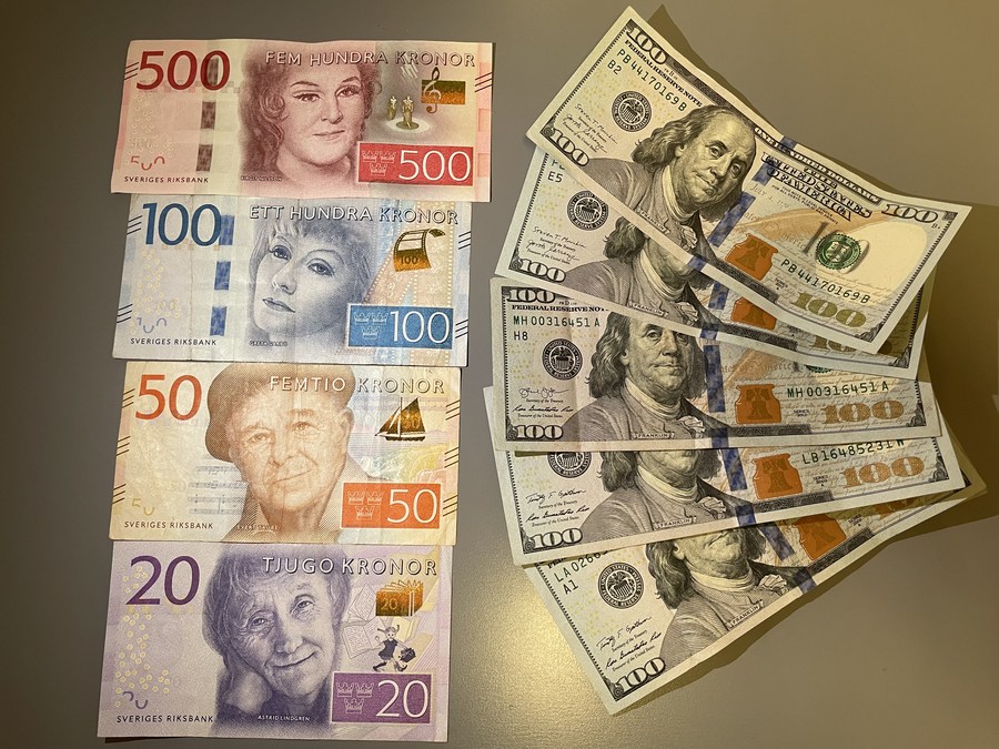 Swedish krona notes and U.S. dollar notes are pictured in Stockholm, Sweden, Sept. 22, 2022. (Xinhua/Fu Yiming)■