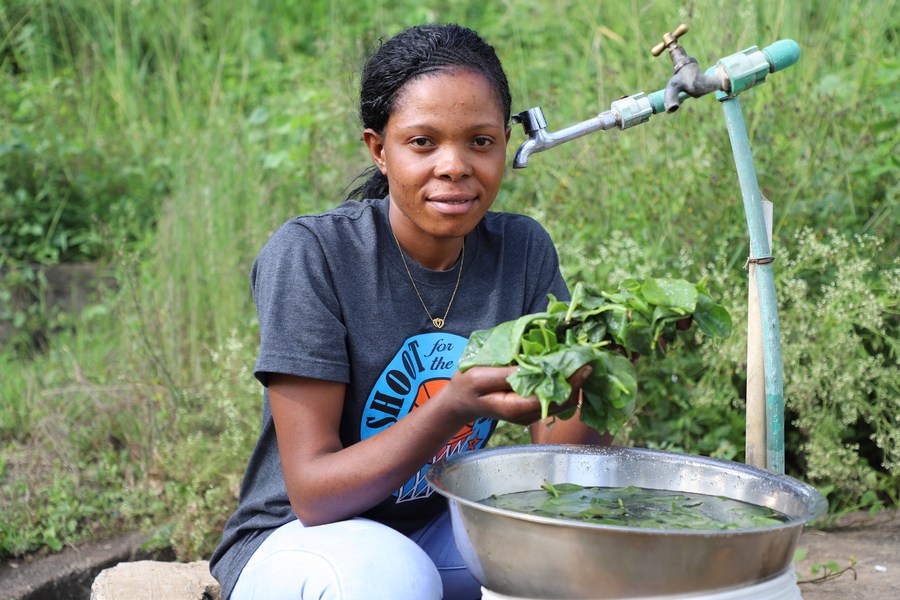 A resident washes vegetables with water provided by the Arusha new water supply system project undertaken by Power Construction Corporation of China, in Arusha, Tanzania, on Jan. 28, 2024. (Xinhua/Hua Hongli)