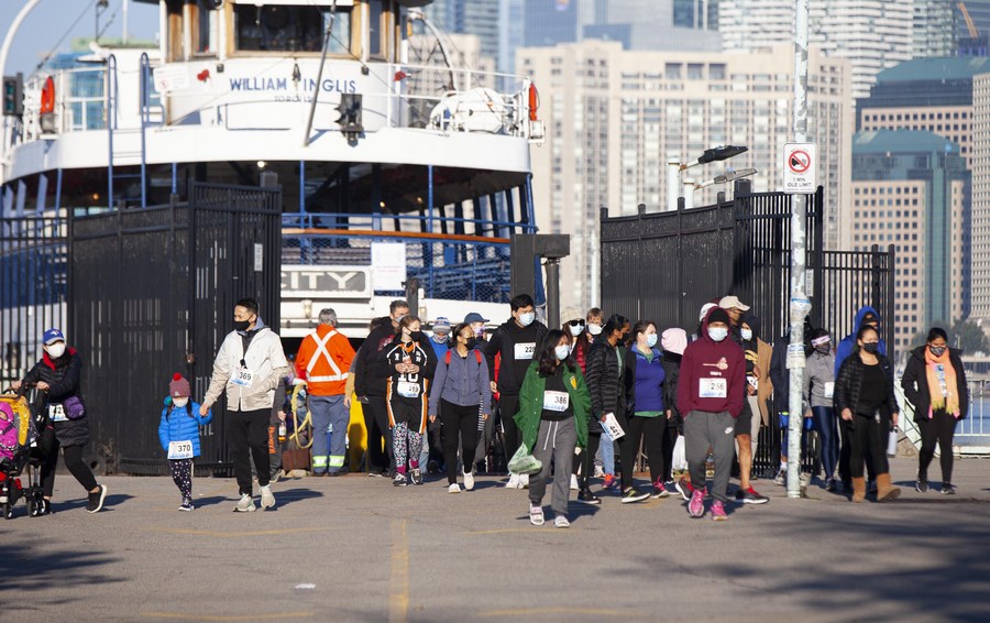 Passengers wearing face masks depart a ferry at the dock area of Ward Island in Toronto, Canada, on Oct. 24, 2021. (Xinhua/Zou Zheng)