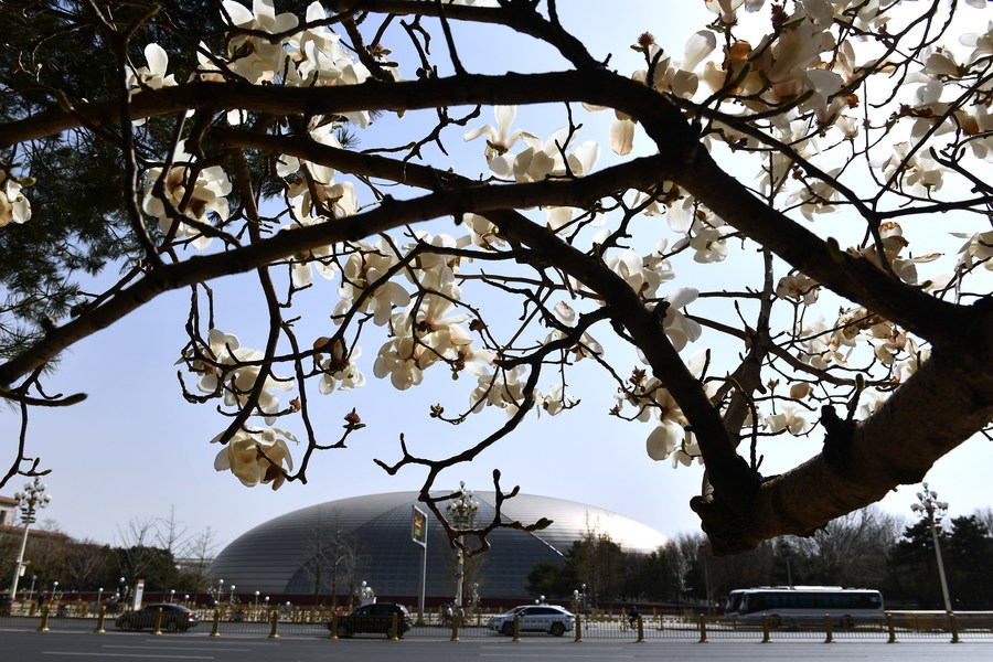 Blooming magnolia flowers are seen near the National Center for the Performing Arts in Beijing, capital of China, March 24, 2021. (Xinhua/Luo Xiaoguang)