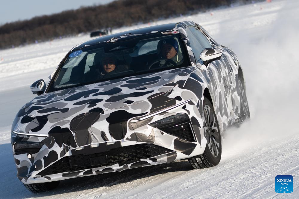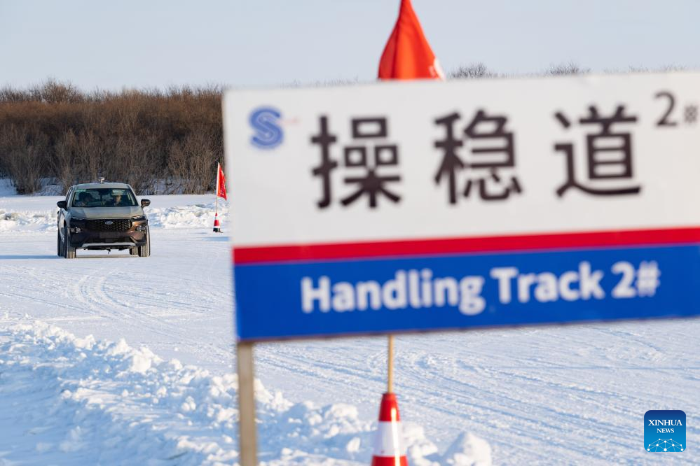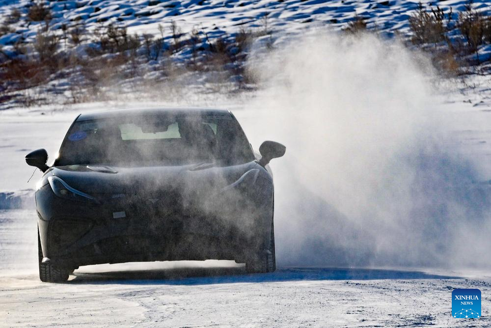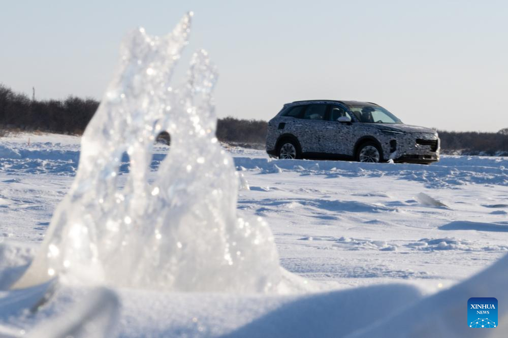 A vehicle undergoes cold-area testing at the Xiaowusili car testing base in Heihe, northeast China's Heilongjiang Province, Jan. 31, 2024. Before a new car product goes on sale, it has to undergo cold-weather testing. Heihe, a city in China's northernmost province of Heilongjiang, has various favorable conditions for cold-area car testing, including diverse landforms and cold, dry weather in the winter. Its high-quality services have drawn more and more carmakers to test new products in the city in recent years. On Jan. 9, the city entered a 120-day annual car testing season.