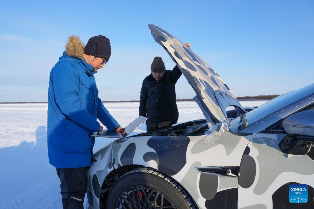 Engineer Yao Dong (L) checks the condition of a car after cold-area car testing at the Xiaowusili car testing base in Heihe, northeast China's Heilongjiang Province, Jan. 31, 2024. Before a new car product goes on sale, it has to undergo cold-weather testing. Heihe, a city in China's northernmost province of Heilongjiang, has various favorable conditions for cold-area car testing, including diverse landforms and cold, dry weather in the winter. Its high-quality services have drawn more and more carmakers to test new products in the city in recent years. On Jan. 9, the city entered a 120-day annual car testing season.