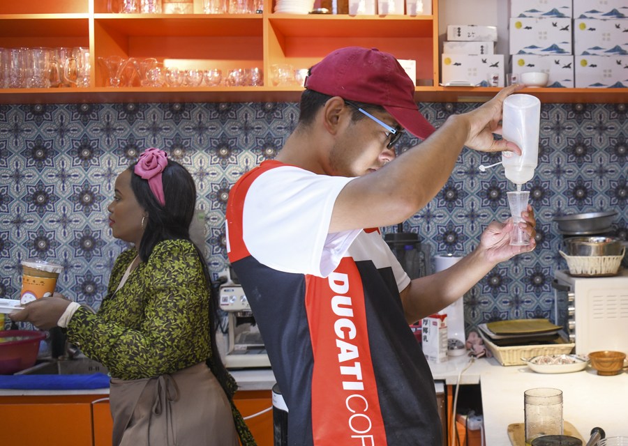 Dilshat Tursun (R) and his wife, Hadiya Msham Abulla, make drinks at their cafe in Kashgar, northwest China's Xinjiang Uygur Autonomous Region, Sept. 15, 2023. (Xinhua/Wang Fei)