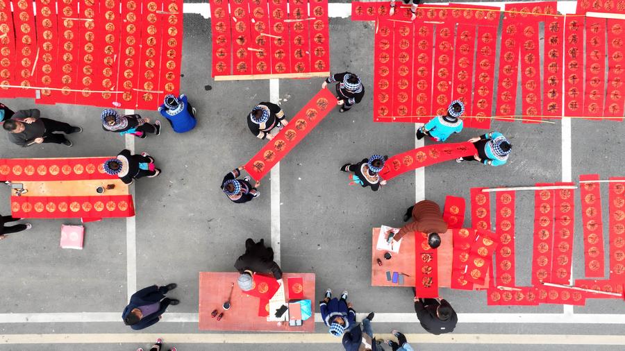 An aerial drone photo taken on Feb. 1, 2024 shows calligraphers writing Spring Festival couplets for residents in Honghe Village of Luodian County, Bouyei-Miao Autonomous Prefecture of Qiannan, southwest China's Guizhou Province. (Xinhua/Yang Ying)A resident selects products for the upcoming Spring Festival in Funan County of Fuyang, east China's Anhui Province, Feb. 1, 2024. (Photo by Lyu Naiming/Xinhua)People pose for a photo with Chinese character "Fu" which means "good fortune" onboard G4835 bullet train, Feb. 1, 2024. (Xinhua/Xu Yu)This photo taken on Jan. 29, 2024 shows clones of Apeijiaza cattle in Yunyang County, southwest China's Chongqing Municipality. Chinese scientists recently confirmed the world's first successful cloning of endangered cattle breeds found in southwest China's Xizang Autonomous Region. The Zhangmu and the Apeijiaza, two rare yellow cattle breeds native to the Qinghai-Xizang Plateau, are strategic resources for China, as these breeds can help researchers breed varieties well adapted to the harsh high-altitude environment. Yunyang County in southwest China's Chongqing Municipality saw the birth of four clones of each breed and they are currently in good condition. (Xinhua/Liu Shiping)An aerial drone photo taken on Jan. 31, 2024 shows the Tian'e Longtan Bridge in south China's Guangxi Zhuang Autonomous Region. Tian'e Longtan Bridge, a steel-reinforced concrete arch bridge over 600 meters long, opened to traffic on Thursday in south China's Guangxi Zhuang Autonomous Region. The bridge over Hongshui River, situated in Tian'e County in Hechi City of Guangxi, is a two-way four-lane bridge with a total length of 2,488.55 meters. It is the world's longest steel-reinforced concrete arch bridge in terms of span. (Xinhua)A staff member looks for goods at a logistics center in the Heihe Area of China (Heilongjiang) Pilot Free Trade Zone in Heihe, northeast China's Heilongjiang Province, Jan. 31, 2024. In 2023, the Heihe Area of China (Heilongjiang) Pilot Free Trade Zone saw a remarkable surge in foreign trade, achieving a total import and export value of 24.482 billion yuan (about 3.4 billion U.S. dollars), marking an annual growth of 56.9 percent. Meanwhile, a total of 16 foreign-funded enterprises were attracted to the area, resulting in a direct utilization of foreign capital totaling 1.273 million U.S. dollars, up 27.3 percent year on year. (Xinhua/Xie Jianfei)Workers inspect the route of Guiyang-Nanning high-speed railway for Spring Festival travel rush on Feb. 1, 2024. (Xinhua/Zhang Ailin)Children participate in ice and snow fun games at an ice rink in Hohhot, north China's Inner Mongolia Autonomous Region, Feb. 1, 2024. (Xinhua/Li Zhipeng)A dragon-themed installation celebrating the Chinese New Year is pictured at Marina Bay Sands mall in Singapore, Feb. 1, 2024. (Photo by Then Chih Wey/Xinhua)This photo taken on Jan. 30, 2024 shows farmers blocking highways with tractors during their protests near Karditsa, Greece. Greek farmers are planning protests across the country for Feb. 1, demanding sufficient financial aid pledged by the government with no delays. Representatives of farmers' associations gathered to discuss mobilization plans at Palamas municipality in the Thessaly region in central Greece, one of the country's main agricultural production regions. According to official estimates, the area was hit hard by a storm in September that caused extensive flooding, resulting in 15 fatalities and huge material damage amounting to about one billion euros (roughly 1.08 billion U.S. dollars). (Xinhua/Marios Lolos)People sit on the bank of Inya Lake in Yangon, Myanmar, Feb. 1, 2024. Myanmar's National Defense and Security Council (NDSC) on Wednesday extended the state of emergency in the Southeast Asian country for six more months, the council's information team said. (Photo by Myo Kyaw Soe/Xinhua)Photo taken on Feb. 1, 2024 shows the sunset in Cairo, Egypt. (Xinhua/Sui Xiankai)The mascot Moongcho and volunteers put out the digital cauldron at Gangneung Olympic Park during the closing ceremony of Gangwon 2024 Winter Youth Olympic Games in Gangneung, South Korea, Feb. 1, 2024. (Xinhua/Zhang Xiaoyu)■