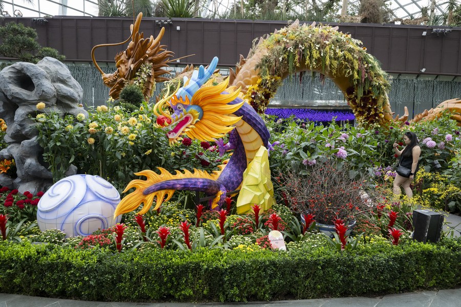 A dragon-themed installation celebrating the Chinese New Year is pictured in the Flower Dome of Gardens by the Bay in Singapore, Feb. 1, 2024. (Photo by Then Chih Wey/Xinhua)