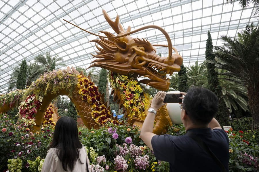 Tourists take photos of a Chinese New Year decoration in the Flower Dome of Gardens by the Bay in Singapore, Feb. 1, 2024. (Photo by Then Chih Wey/Xinhua)