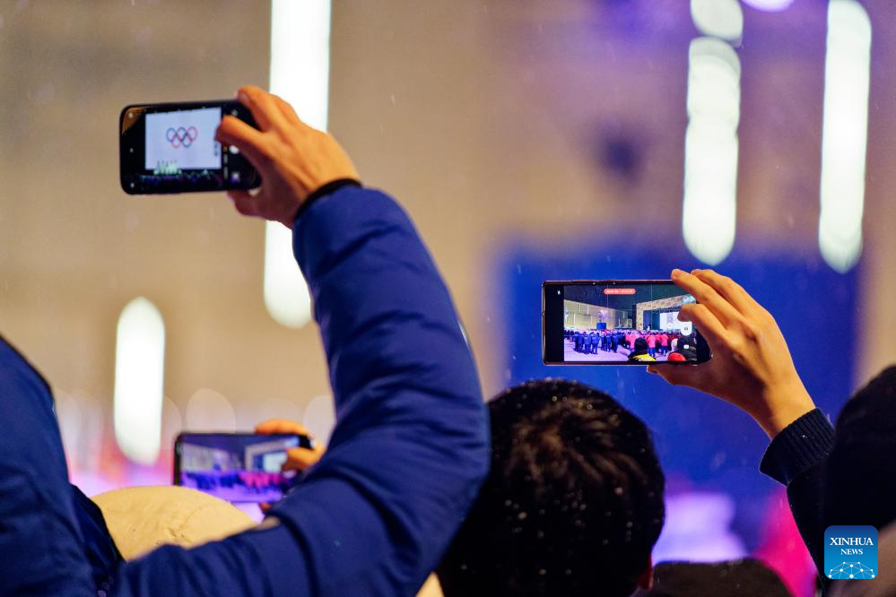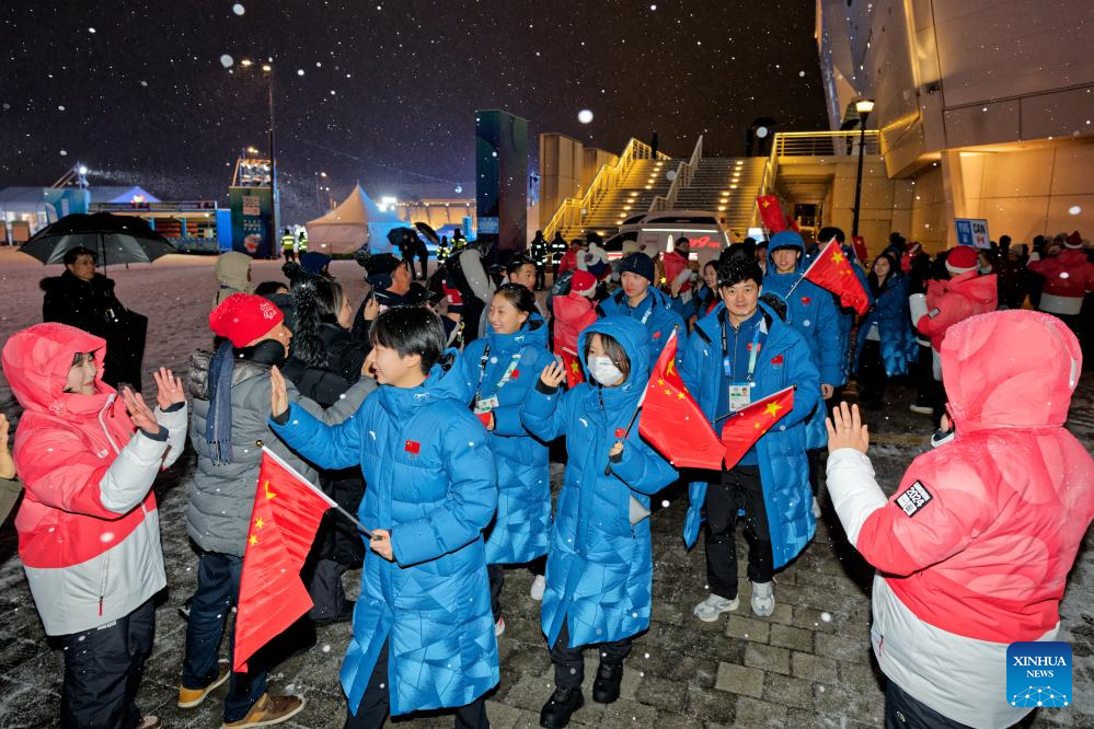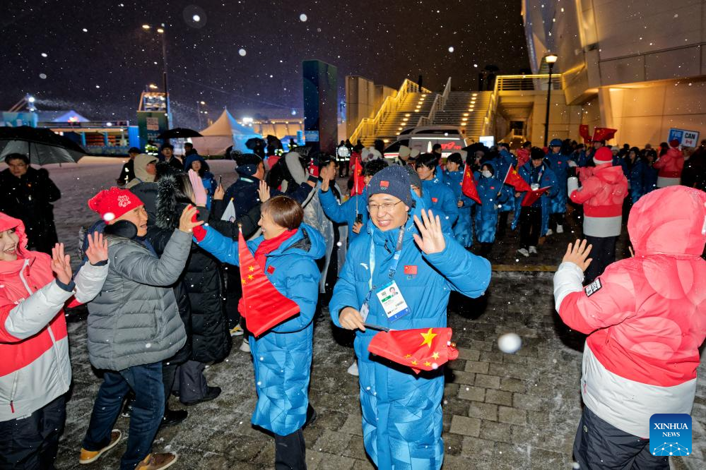 Members of the Chinese delegation enter the site before the closing ceremony of Gangwon 2024 Winter Youth Olympic Games in Gangneung, South Korea, Feb. 1, 2024. (Xinhua/Zhang Xiaoyu)