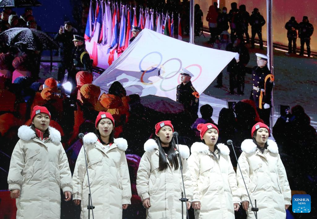 A choir sing while the Olympic flag is lowered during the closing ceremony of Gangwon 2024 Winter Youth Olympic Games in Gangneung, South Korea, Feb. 1, 2024. (Xinhua/Yao Qilin)