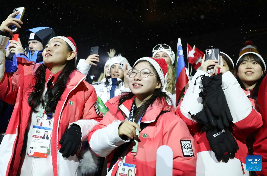 Representatives of athletes and volunteers take photos during the closing ceremony of Gangwon 2024 Winter Youth Olympic Games in Gangneung, South Korea, Feb. 1, 2024. (Xinhua/Yao Qilin)