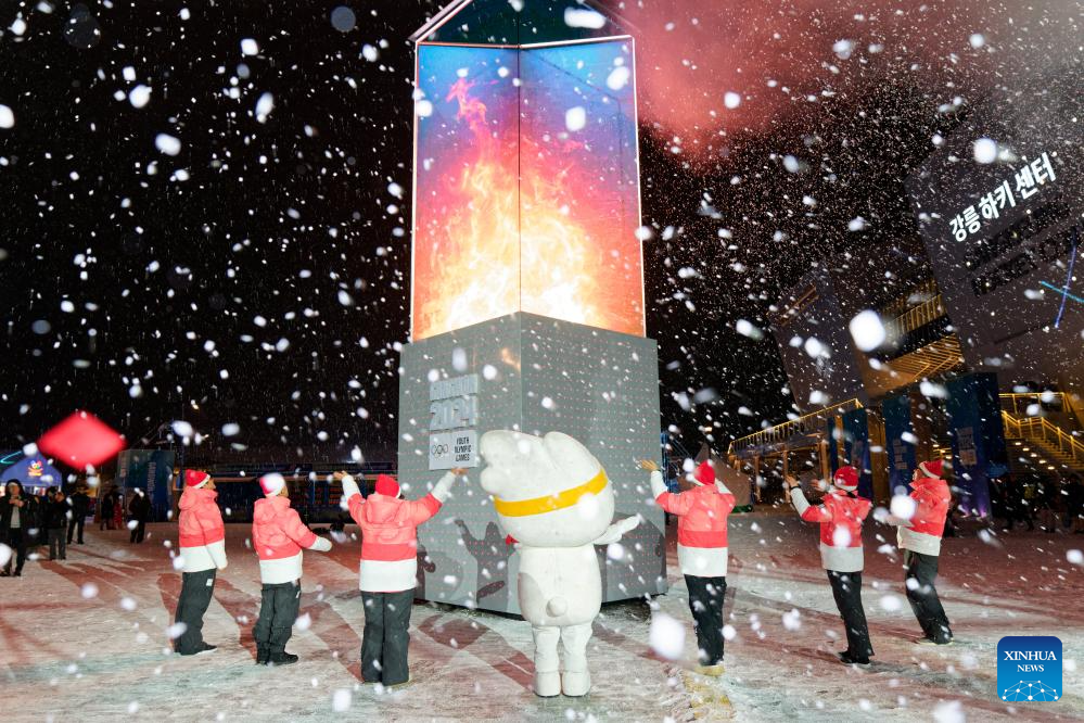 The mascot Moongcho and volunteers put out the digital cauldron at Gangneung Olympic Park during the closing ceremony of Gangwon 2024 Winter Youth Olympic Games in Gangneung, South Korea, Feb. 1, 2024. (Xinhua/Zhang Xiaoyu)