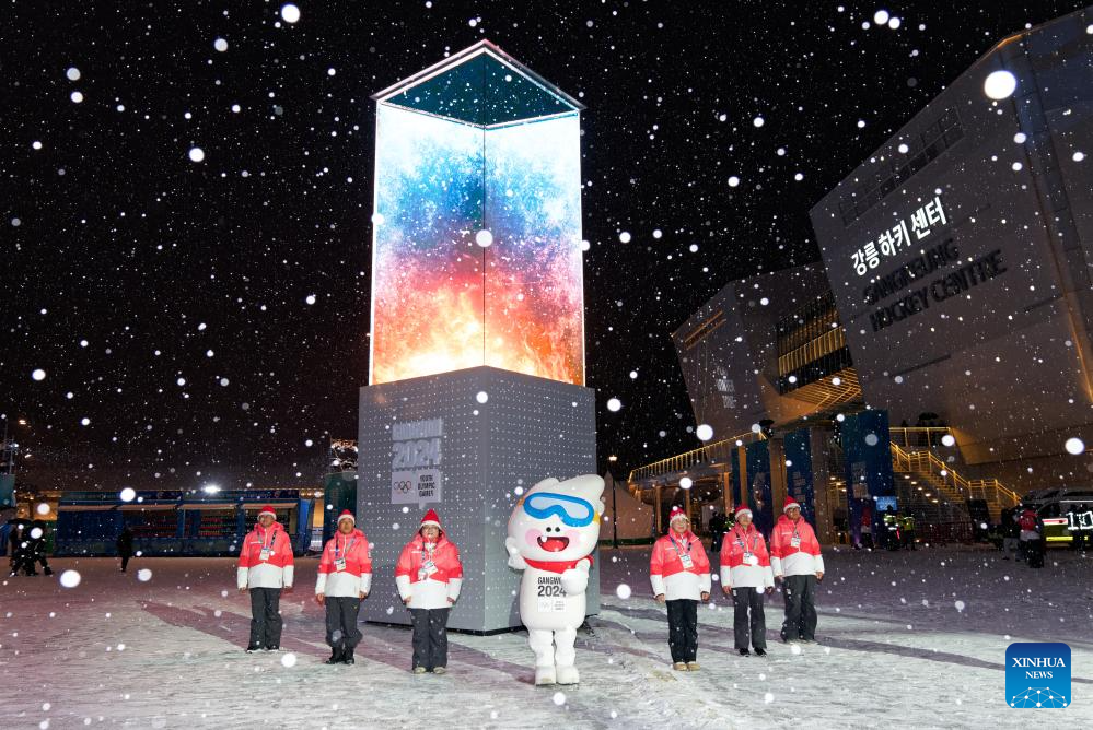 The mascot Moongcho and volunteers prepare to put out the digital cauldron at Gangneung Olympic Park during the closing ceremony of Gangwon 2024 Winter Youth Olympic Games in Gangneung, South Korea, Feb. 1, 2024. (Xinhua/Zhang Xiaoyu)
