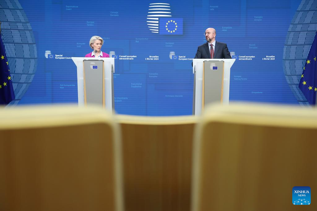 European Council President Charles Michel (R) and European Commission President Ursula von der Leyen attend a press conference during a special European Union (EU) summit in Brussels, Belgium, Feb. 1, 2024. (Xinhua/Zhao Dingzhe)
