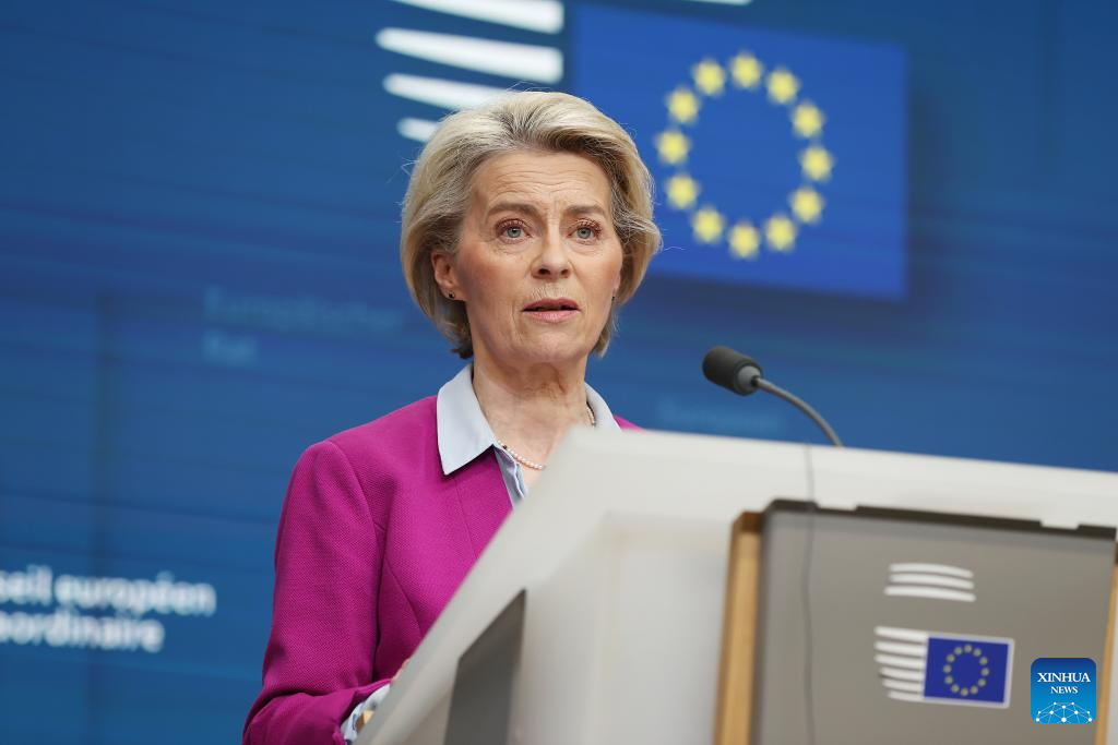 European Commission President Ursula von der Leyen attends a press conference during a special European Union (EU) summit in Brussels, Belgium, Feb. 1, 2024.(Xinhua/Zhao Dingzhe)