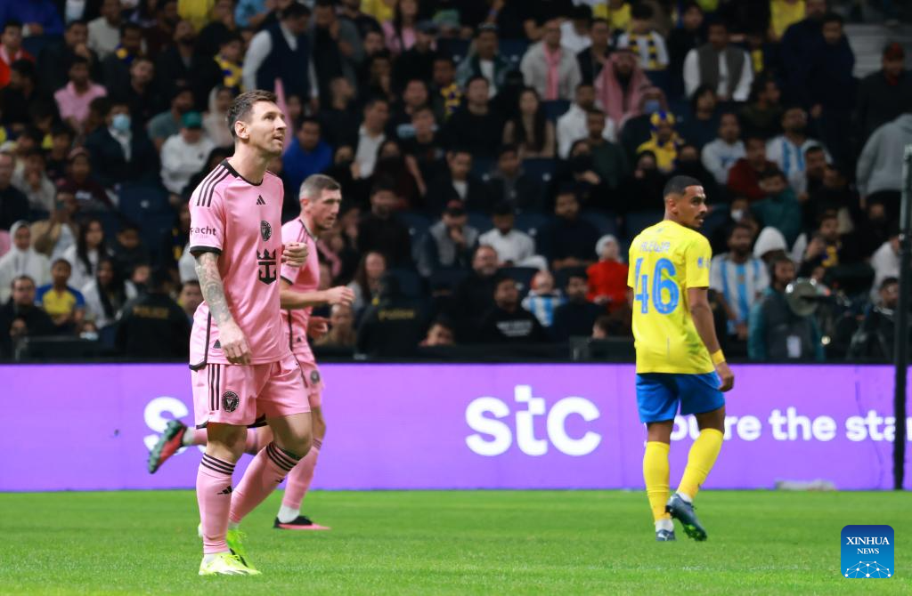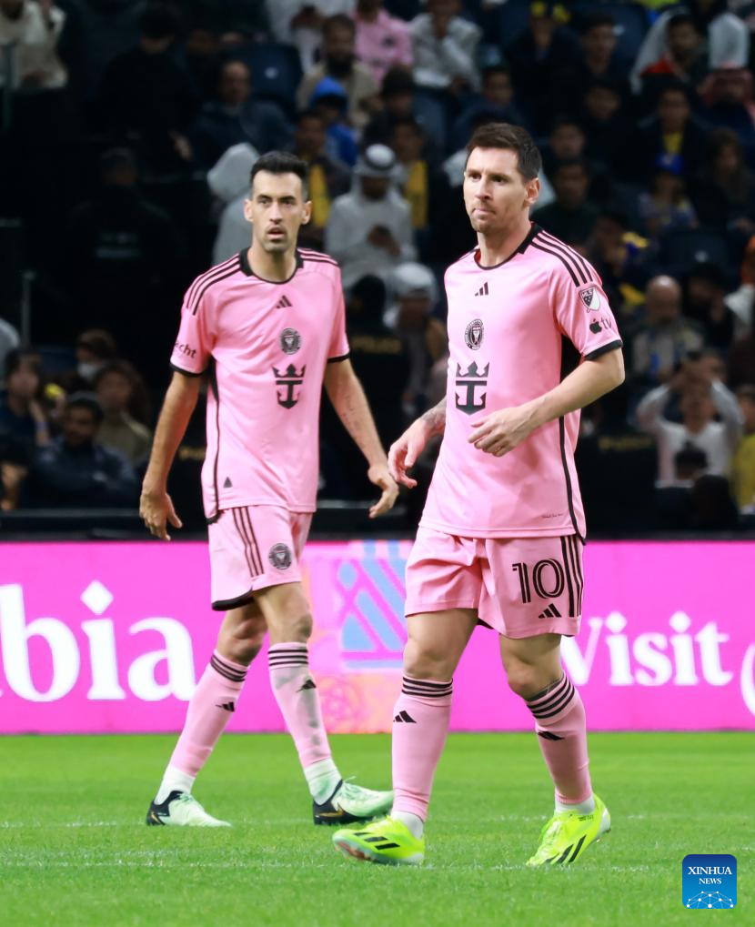 Inter Miami's Lionel Messi (L) looks on during the friendly football match between Saudi Arabia's Al-Nassr FC and the US Inter Miami CF at the Kingdom Arena Stadium in Riyadh, Saudi Arabia, Feb. 1, 2024. (Xinhua/Wang Haizhou)