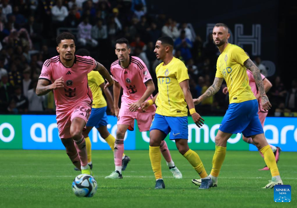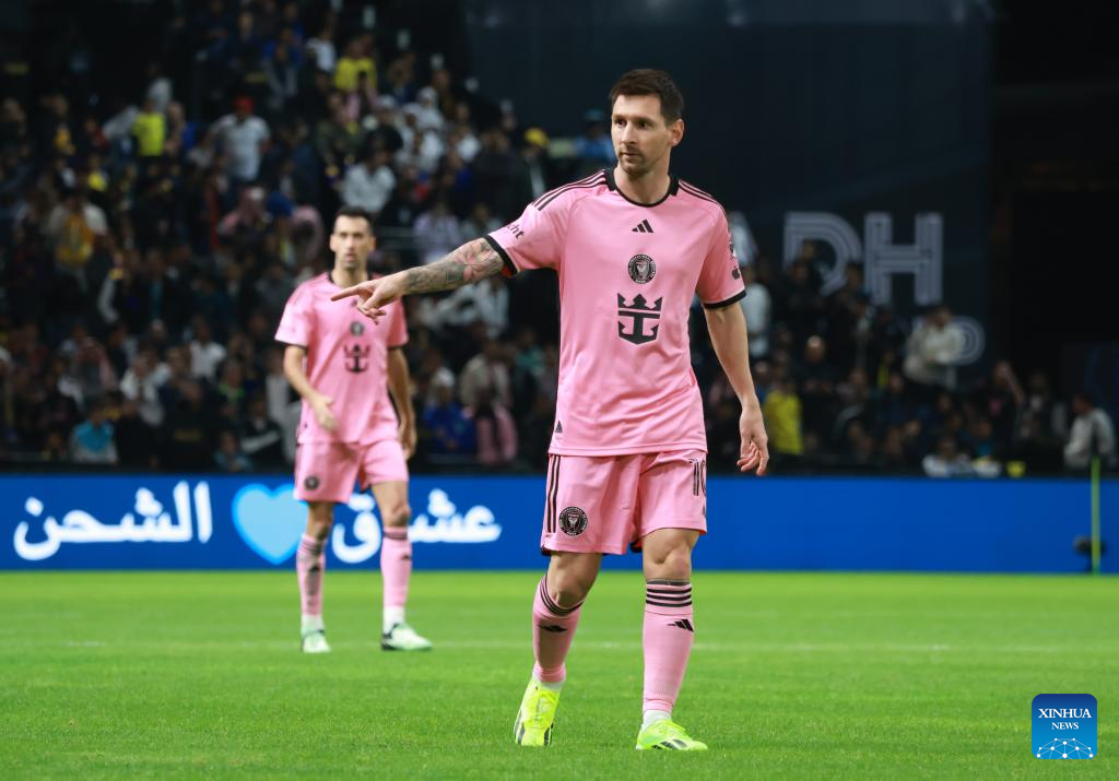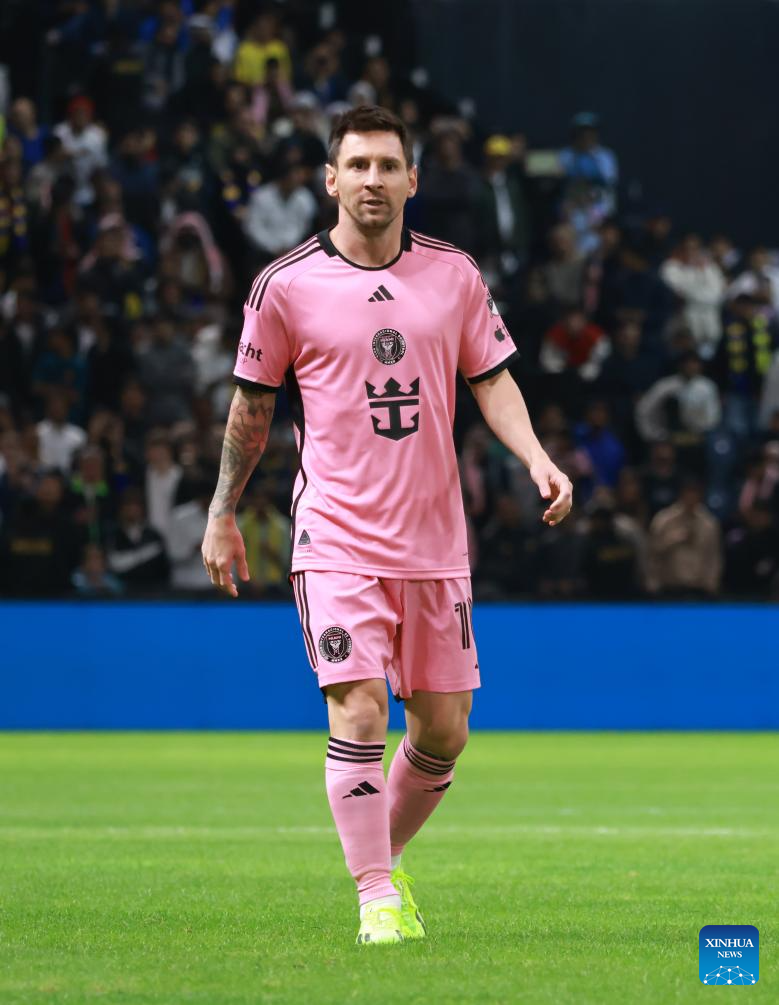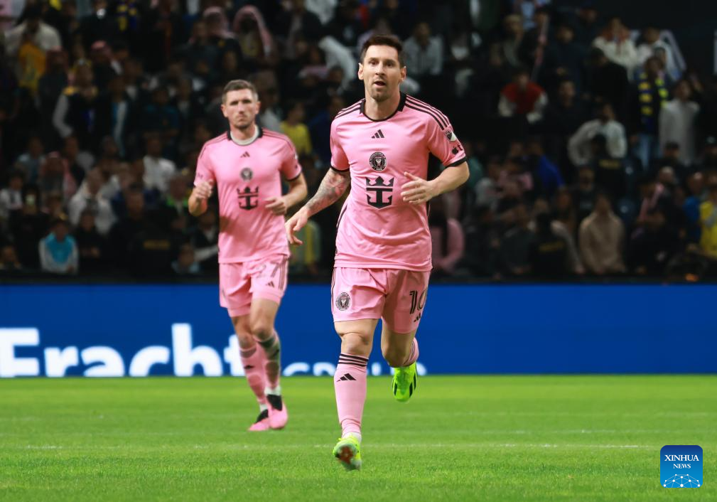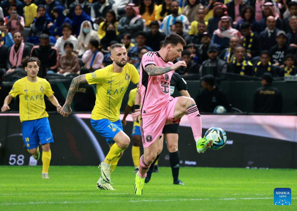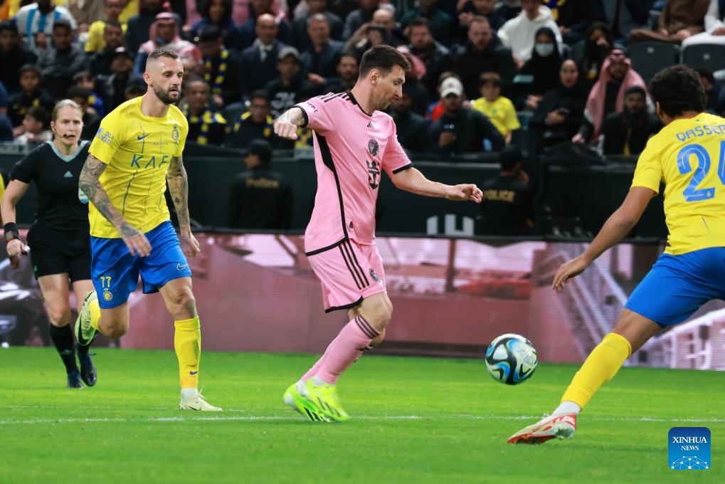 Inter Miami's Lionel Messi (R) controls the ball during the friendly football match between Saudi Arabia's Al-Nassr FC and the US Inter Miami CF at the Kingdom Arena Stadium in Riyadh, Saudi Arabia, Feb. 1, 2024. (Xinhua/Wang Haizhou)