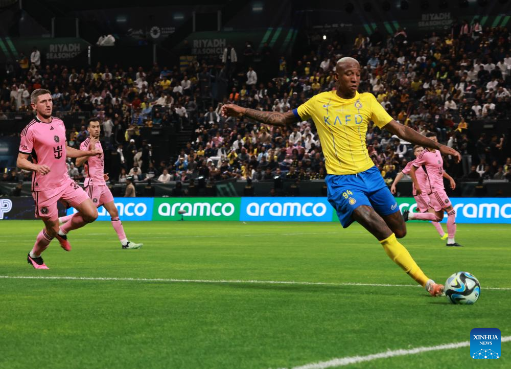 Anderson Talisca (R) of Al-Nassr kicks the ball during the friendly football match between Saudi Arabia's Al-Nassr FC and the US Inter Miami CF at the Kingdom Arena Stadium in Riyadh, Saudi Arabia, Feb. 1, 2024. (Xinhua/Wang Haizhou)