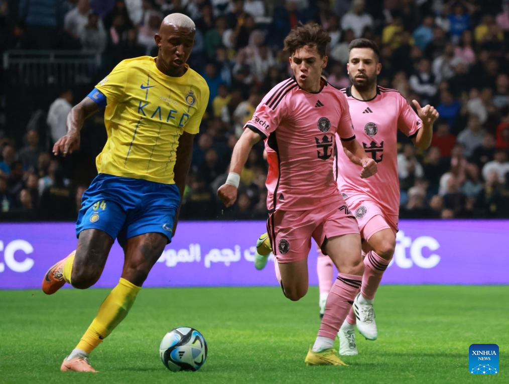 Anderson Talisca (L) of Al-Nassr vies with Inter Miami's Noah Allen during the friendly football match between Saudi Arabia's Al-Nassr FC and the US Inter Miami CF at the Kingdom Arena Stadium in Riyadh, Saudi Arabia, Feb. 1, 2024. (Xinhua/Wang Haizhou)