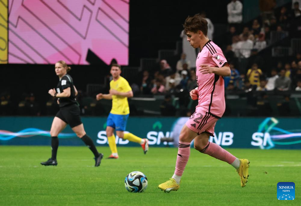 Inter Miami's Noah Allen dribbles the ball during the friendly football match between Saudi Arabia's Al-Nassr FC and the US Inter Miami CF at the Kingdom Arena Stadium in Riyadh, Saudi Arabia, Feb. 1, 2024. (Xinhua/Wang Haizhou)