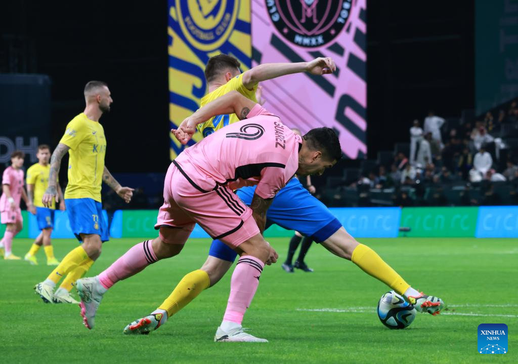 Inter Miami's Luis Suarez (front) defends during the friendly football match between Saudi Arabia's Al-Nassr FC and the US Inter Miami CF at the Kingdom Arena Stadium in Riyadh, Saudi Arabia, Feb. 1, 2024. (Xinhua/Wang Haizhou)