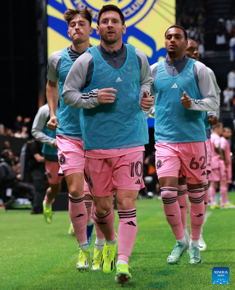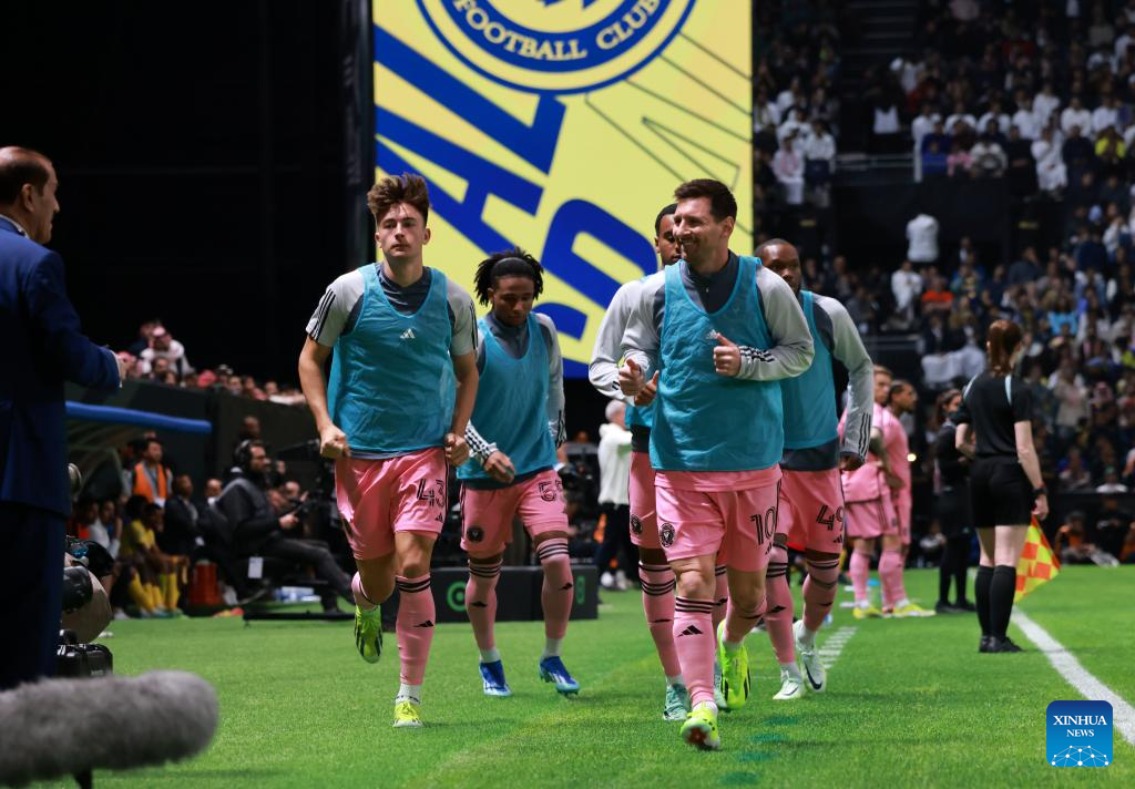 Inter Miami's Lionel Messi (R) warms up during the friendly football match between Saudi Arabia's Al-Nassr FC and the US Inter Miami CF at the Kingdom Arena Stadium in Riyadh, Saudi Arabia, Feb. 1, 2024. (Xinhua/Wang Haizhou)