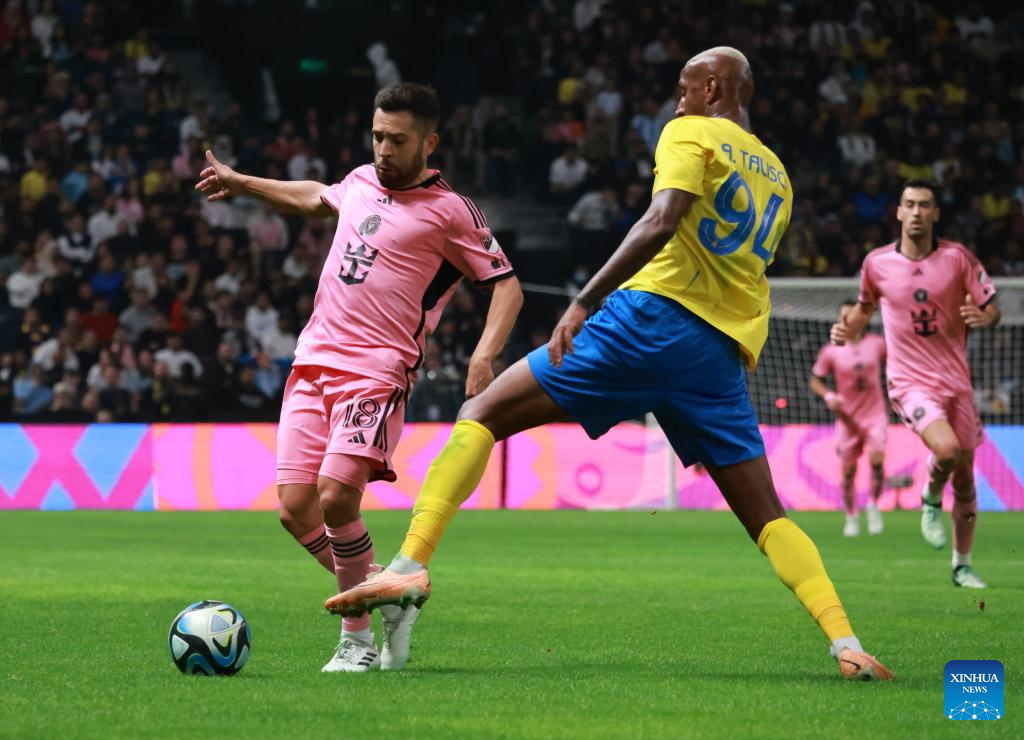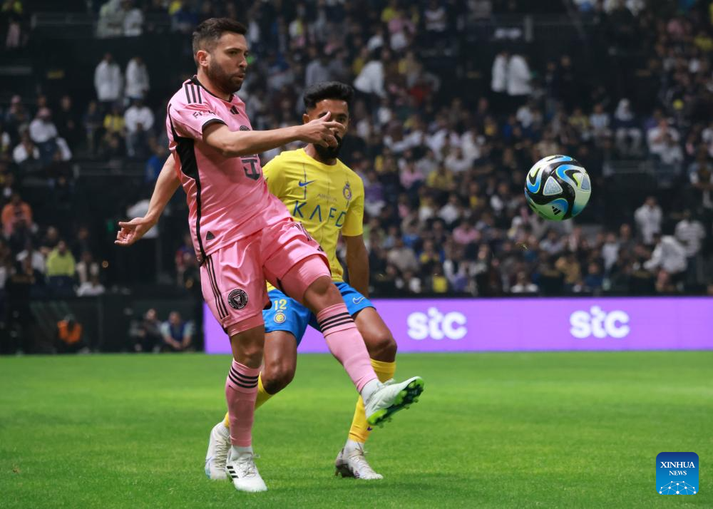 Inter Miami's Jordi Alba (L) vies with Nawaf Boushal of Al-Nassr during the friendly football match between Saudi Arabia's Al-Nassr FC and the US Inter Miami CF at the Kingdom Arena Stadium in Riyadh, Saudi Arabia, Feb. 1, 2024. (Xinhua/Wang Haizhou)