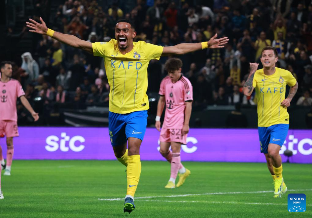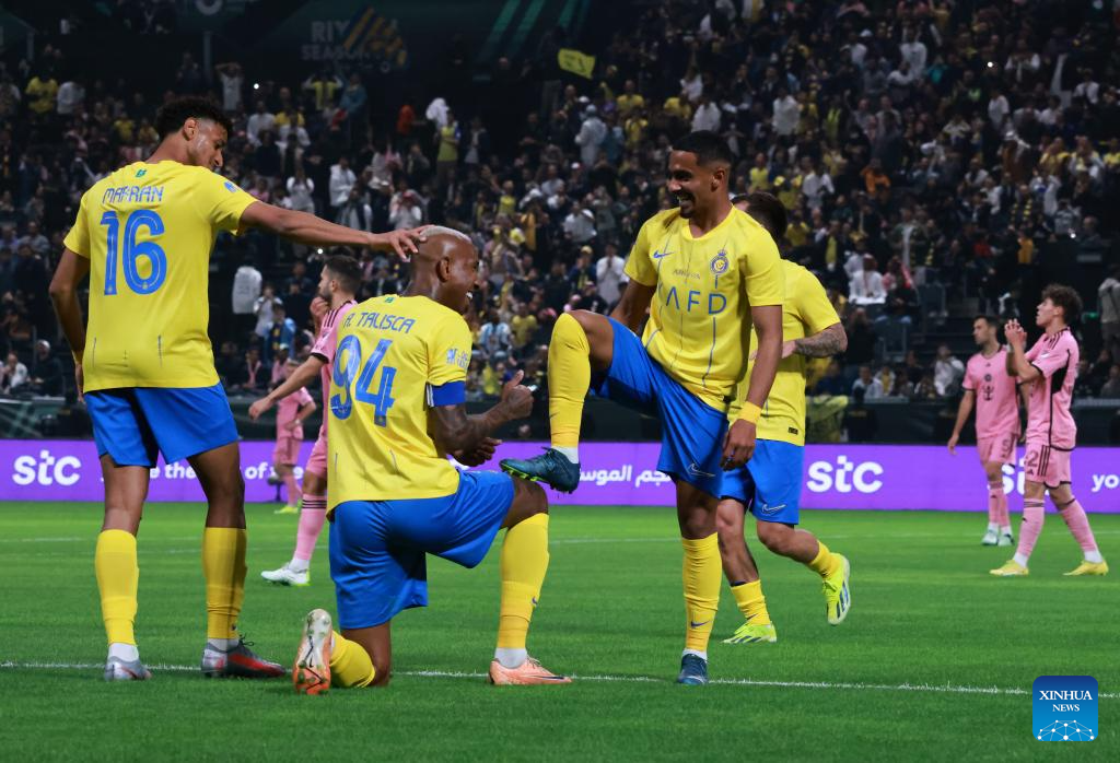 Abdulaziz Al Aliwa (2nd L) of Al-Nassr celebrates Anderson Talisca's goal during the friendly football match between Saudi Arabia's Al-Nassr FC and the US Inter Miami CF at the Kingdom Arena Stadium in Riyadh, Saudi Arabia, Feb. 1, 2024. (Xinhua/Wang Haizhou)